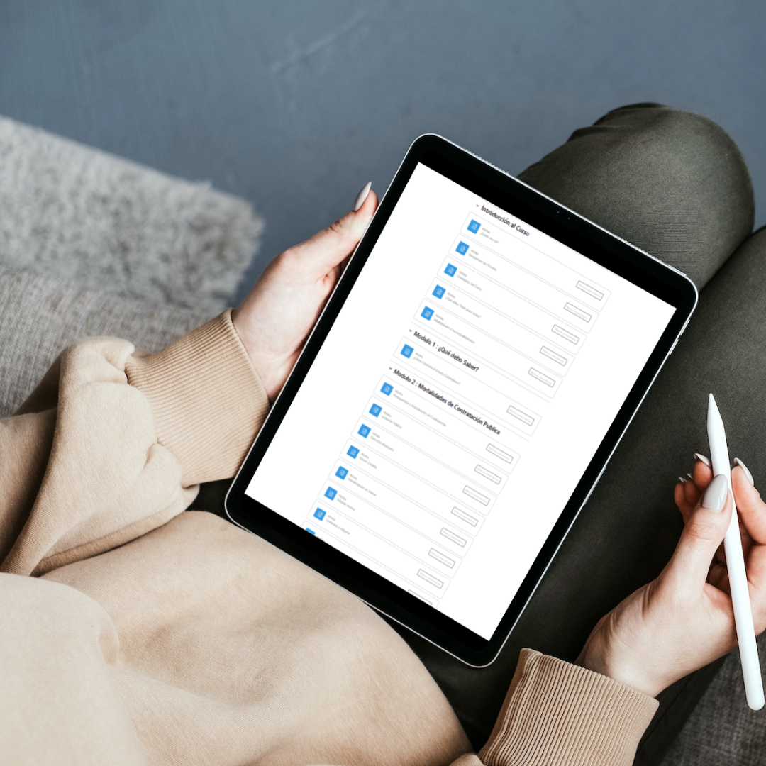 El curso esta diseñado en videos tutoriales y prácticos separados por tema, adicional archivos descargables que sirven como herramientas para licitar.